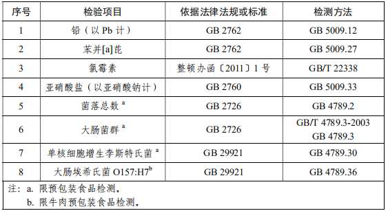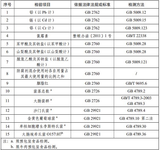 GB 2760 食品安全國家標準 食品添加劑使用標準 GB 2762 食品安全國家標準 食品中污染物限量 GB 4789.2 食品安全國家標準 食品微生物學檢驗 菌落總數測定 GB 4789.3 食品安全國家標準 食品微生物學檢驗 大腸菌群計數 GB/T 4789.3 -2003 食品衛生微生物學檢驗 大腸菌群測定 GB 4789.4 食品安全國家標準 食品微生物學檢驗 沙門氏菌檢驗 GB 4789.10 食品安全國家標準 食品微生物學檢驗 金黃色葡萄球菌檢驗 GB 4789.26 食品安全國家標準 食品微生物學檢驗 商業無菌檢驗 GB 4789.30 食品安全國家標準 食品微生物學檢驗 單核細胞增生李斯特氏菌檢驗 GB 4789.36 食品安全國家標準 食品微生物學檢驗 大腸埃希氏菌 O157:H7/NM 檢驗 GB 5009.11 食品安全國家標準 食品中總砷及無機砷的測定 GB 5009.12 食品安全國家標準 食品中鉛的測定 GB 5009.15 食品安全國家標準 食品中鎘的測定 GB 5009.27 食品安全國家標準 食品中苯并(a)芘的測定 GB 5009.28 食品安全國家標準 食品中苯甲酸、山梨酸和糖精鈉的測定 GB 5009.33 食品安全國家標準 食品中亞硝酸鹽與硝酸鹽的測定 GB 5009.121 食品安全國家標準 食品中脫氫乙酸的測定 GB 5009.123 食品安全國家標準 食品中鉻的測定 GB/T 9695.6 肉制品 胭脂紅著色劑測定 GB/T 22338 動物源性食品中氯霉素類藥物殘留量測定 GB/T 23586 醬鹵肉制品 GB 29921 食品安全國家標準 食品中致病菌限量 SB/T 10381 真空軟包裝鹵肉制品 SN/T 3536 出口食品中酸性橙 II 號的檢測方法